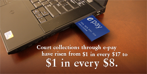 E-pay is increasingly becoming a popular method of choice for defendants paying court-ordered fines, fees, costs and restitution. In 2011 one in every $17 collected by Pennsylvania courts was collected via e-pay. In 2012 that number increased to one in every $10. Through the first quarter of 2013, that figure stood at approximately one in every $8.