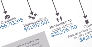 The state received $207 million of the total $455 million collected by the courts. Counties received $156.7 million and municipalities $51.3 million to support local government programs. Crime victims received a total of $35.3 million in restitution, and various entities received $4.3 million. (See court distribution tables)