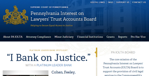 Among other things, the new website (www.paiolta.org) highlights the “I Bank on Justice” Campaign — an initiative to recognize attorneys and firms that use a “Platinum Leader Bank,” or one that pays a 1 percent premium yield on IOLTA accounts.